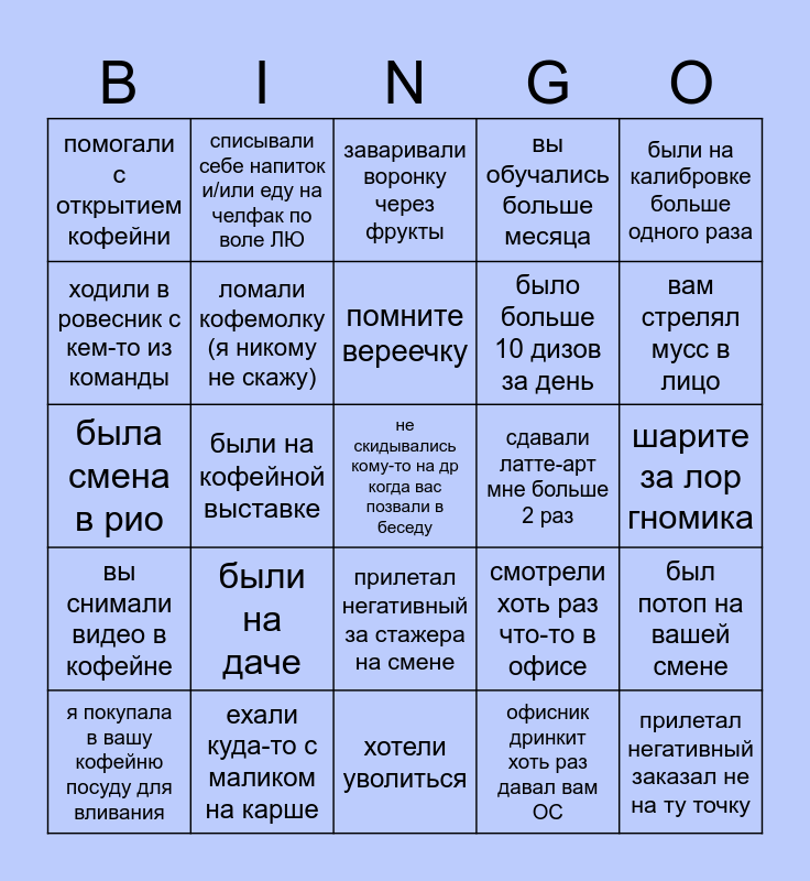 This bingo card has a free space and 24 words: были на даче, ехали куда-то с маликом на карше, помните вереечку, я покупала в вашу кофейню посуду для вливания, были на калибровке больше одного раза, помогали с открытием кофейни, ходили в ровесник с кем-то из команды, списывали себе напиток и/или еду на челфак по воле ЛЮ, сдавали латте-арт мне больше 2 раз, прилетал негативный за стажера на смене, было больше 10 дизов за день, была смена в рио, смотрели хоть раз что-то в офисе, был потоп на вашей смене, ломали кофемолку (я никому не скажу), офисник дринкит хоть раз давал вам ОС, шарите за лор гномика, заваривали воронку через фрукты, вам стрелял мусс в лицо, были на кофейной выставке, прилетал негативный заказал не на ту точку, вы снимали видео в кофейне, вы обучались больше месяца and хотели уволиться.