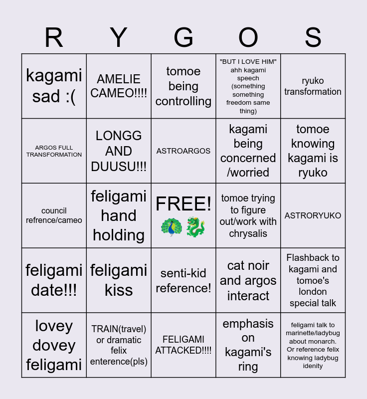 This bingo card has a free space and 24 words: feligami kiss, TRAIN(travel) or dramatic felix enterence(pls), ASTROARGOS, lovey dovey feligami, ryuko transformation, kagami sad :(, ARGOS FULL TRANSFORMATION, AMELIE CAMEO!!!!, tomoe trying to figure out/work with chrysalis, senti-kid reference!, kagami being concerned /worried, council refrence/cameo, cat noir and argos interact, Flashback to kagami and tomoe's london special talk, LONGG AND DUUSU!!!, emphasis on kagami's ring, ASTRORYUKO, tomoe being controlling, tomoe knowing kagami is ryuko, feligami hand holding, feligami talk to marinette/ladybug about monarch. Or reference felix knowing ladybug idenity, feligami date!!!, "BUT I LOVE HIM" ahh kagami speech (something something freedom same thing) and FELIGAMI ATTACKED!!!!.
