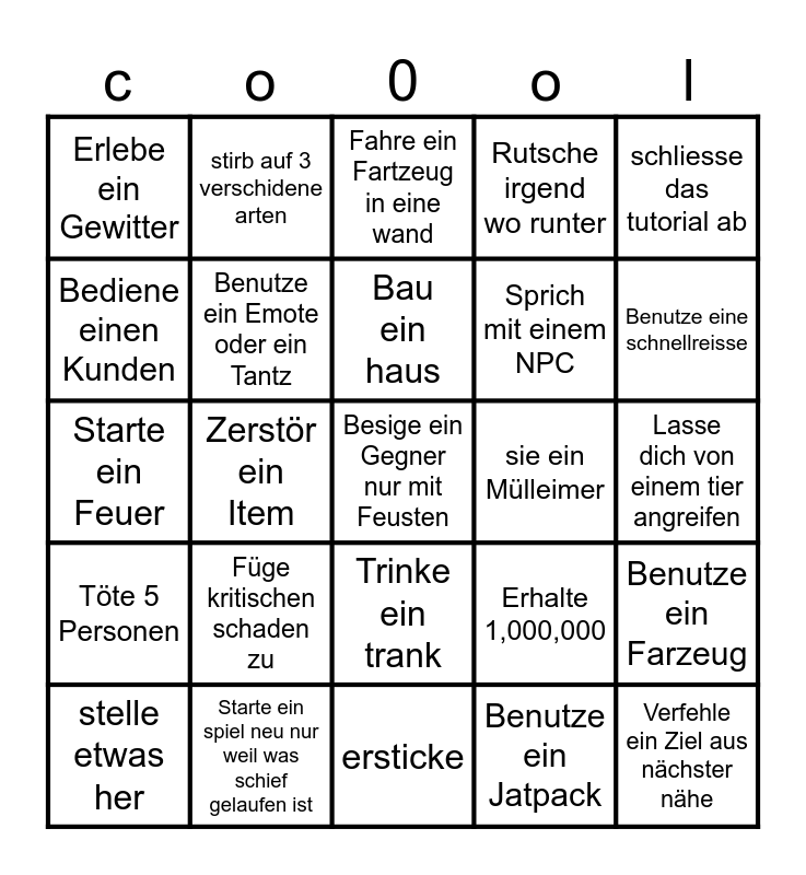 This bingo card has 25 words: Füge kritischen schaden zu, ersticke, Bau ein haus, stelle etwas her, schliesse das tutorial ab, Erlebe ein Gewitter, Bediene einen Kunden, stirb auf 3 verschidene arten, sie ein Mülleimer, Trinke ein trank, Sprich mit einem NPC, Starte ein Feuer, Erhalte 1,000,000, Benutze ein Farzeug, Benutze ein Emote oder ein Tantz, Verfehle ein Ziel aus nächster nähe, Lasse dich von einem tier angreifen, Fahre ein Fartzeug in eine wand, Benutze eine schnellreisse, Zerstör ein Item, Besige ein Gegner nur mit Feusten, Starte ein spiel neu nur weil was schief gelaufen ist, Töte 5 Personen, Rutsche irgend wo runter and Benutze ein Jatpack.