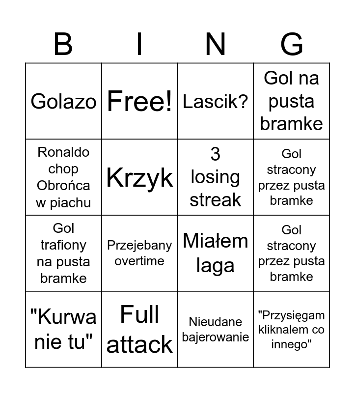 This bingo card has 19 words: Miałem laga, "Laga? Dobra ide wyzej", Lascik?, "Przysięgam kliknalem co innego", Gol stracony przez pusta bramke, Ronaldo chop Obrońca w piachu, Nieudane bajerowanie, Golazo, Free!, Gol trafiony na pusta bramke, Przejebany overtime, Krzyk, 3 losing streak, Full attack, "Kurwa nie tu", Nie trafiony gol, Gol na pusta bramke, Gol stracony przez pusta bramke and Brazylijski luz.