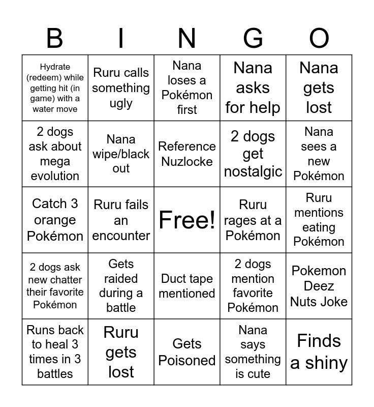 This bingo card has a free space and 43 words: Someone accidently backseats, Finds a shiny, Gets distracted and doesn't do the objective, Runs back to heal 3 times in 3 battles, Ruru rages at a Pokémon, Nana says something is cute, Nana loses a Pokémon first, Ruru loses a Pokémon first, Nana gets lost, Ruru gets lost, Nana asks for help, Ruru rages at a Pokémon, Duct tape mentioned, Gets raided during a battle, Gets Frozen, Gets Poisoned, Gets Burned, Catch 3 orange Pokémon, Catch 3 Blue Pokémon, Nana sees a new Pokémon, Ruru calls something ugly, Scuff with Capture Cards, Sees a dog Pokémon while one streamer is in dog toggle, Hydrate (redeem) while getting hit (in game) with a water move, Spends more than 5 minutes on character customization, Ruru mentions eating Pokémon, French accent, 2 dogs jam to music, 2 dogs mention favorite Pokémon, 2 dogs ask new chatter their favorite Pokémon, Pokemon Copypasta is mentioned, Pokemon Deez Nuts Joke, Nana fails an encounter, Ruru fails an encounter, Nana Swore, Smacks Dumpy, Hydrate spam, Reference Nuzlocke, 2 dogs ask about mega evolution, 2 dogs get nostalgic, Ruru threatens puppos, Nana wipe/black out and Ruru wipe/black out.