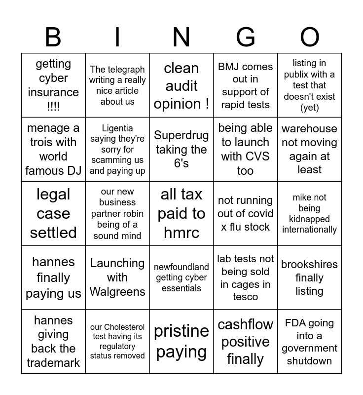 This bingo card has a free space and 24 words: Launching with Walgreens, our Cholesterol test having its regulatory status removed, Superdrug taking the 6's, hannes giving back the trademark, listing in publix with a test that doesn't exist (yet), getting cyber insurance !!!!, menage a trois with world famous DJ, The telegraph writing a really nice article about us, not running out of covid x flu stock, newfoundland getting cyber essentials, being able to launch with CVS too, legal case settled, lab tests not being sold in cages in tesco, brookshires finally listing, Ligentia saying they're sorry for scamming us and paying up, cashflow positive finally, mike not being kidnapped internationally, clean audit opinion !, warehouse not moving again at least, our new business partner robin being of a sound mind, FDA going into a government shutdown, hannes finally paying us, BMJ comes out in support of rapid tests and pristine paying.