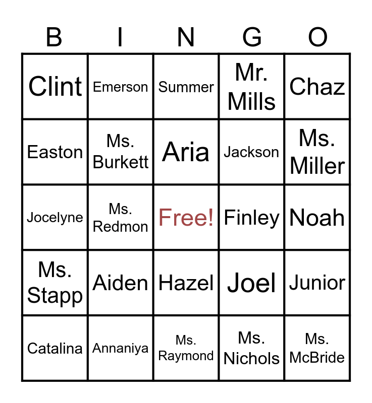 This bingo card has a free space and 24 words: Aiden, Annaniya, Aria, Catalina, Chaz, Clint, Easton, Emerson, Finley, Hazel, Jackson, Jocelyne, Joel, Junior, Ms. Burkett, Ms. Nichols, Noah, Summer, Ms. Miller, Ms. Redmon, Ms. McBride, Ms. Stapp, Mr. Mills and Ms. Raymond.