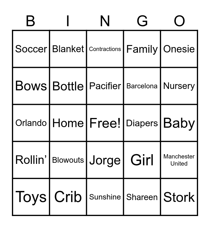 This bingo card has a free space and 24 words: Blowouts, Crib, Pacifier, Toys, Onesie, Soccer, Bows, Blanket, Diapers, Jorge, Barcelona, Orlando, Girl, Manchester United, Bottle, Shareen, Baby, Contractions, Nursery, Home, Stork, Rollin’, Family and Sunshine.