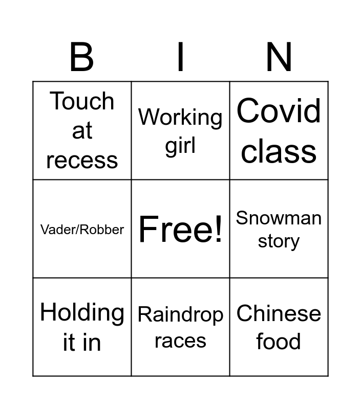 This bingo card has a free space and 8 words: Snowman story, Covid class, Working girl, Holding it in, Touch at recess, Chinese food, Vader/Robber and Raindrop races.