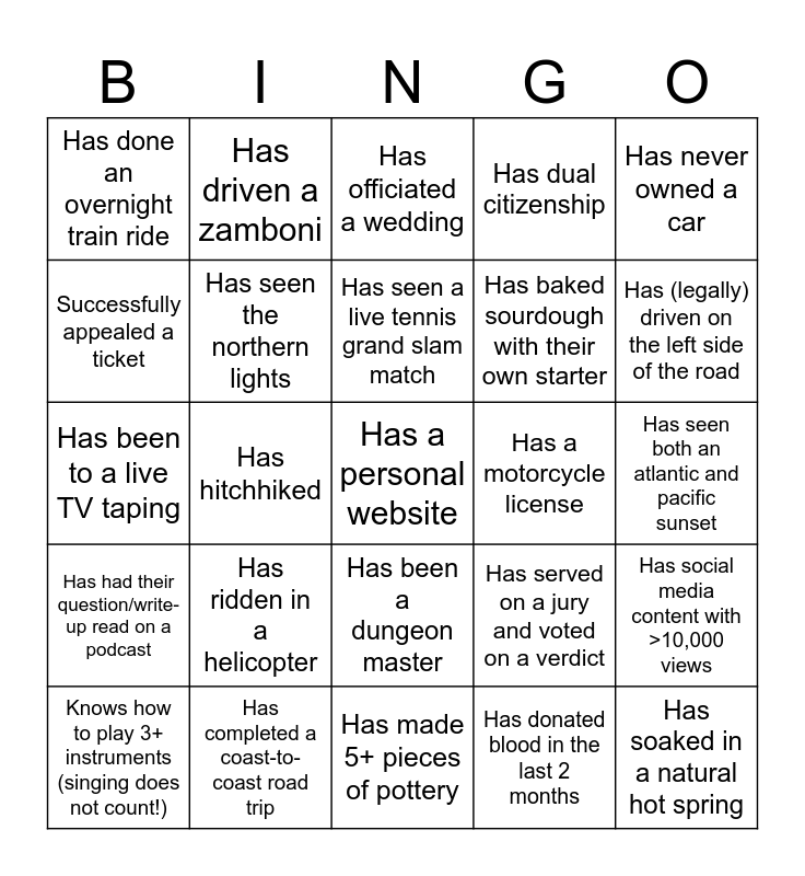 This bingo card has 31 words: Has made 5+ pieces of pottery, Speaks multiple languages, Has hitchhiked, Has the same birthday as you, Has done an overnight train ride, Has officiated a wedding, Has seen the northern lights, Has served on a jury and voted on a verdict, Has a motorcycle license, Has donated blood in the last 2 months, Has seen both an atlantic and pacific sunset, Has a personal website, Has soaked in a natural hot spring, Has seen a bear in the wild, Has (legally) driven on the left side of the road, Has a duolingo streak of at least 1 year, Has social media content with >10,000 views, Has ridden in a helicopter, Has had their question/write-up read on a podcast, Has been a dungeon master, Has never owned a car, Has been on TV, Knows how to play 3+ instruments (singing does not count!), Has driven a zamboni, Has baked sourdough with their own starter, Successfully appealed a ticket, Has dual citizenship, Has been to a live TV taping, Has completed a coast-to-coast road trip, Has seen a live tennis grand slam match and Has camped overnight at a music festival.