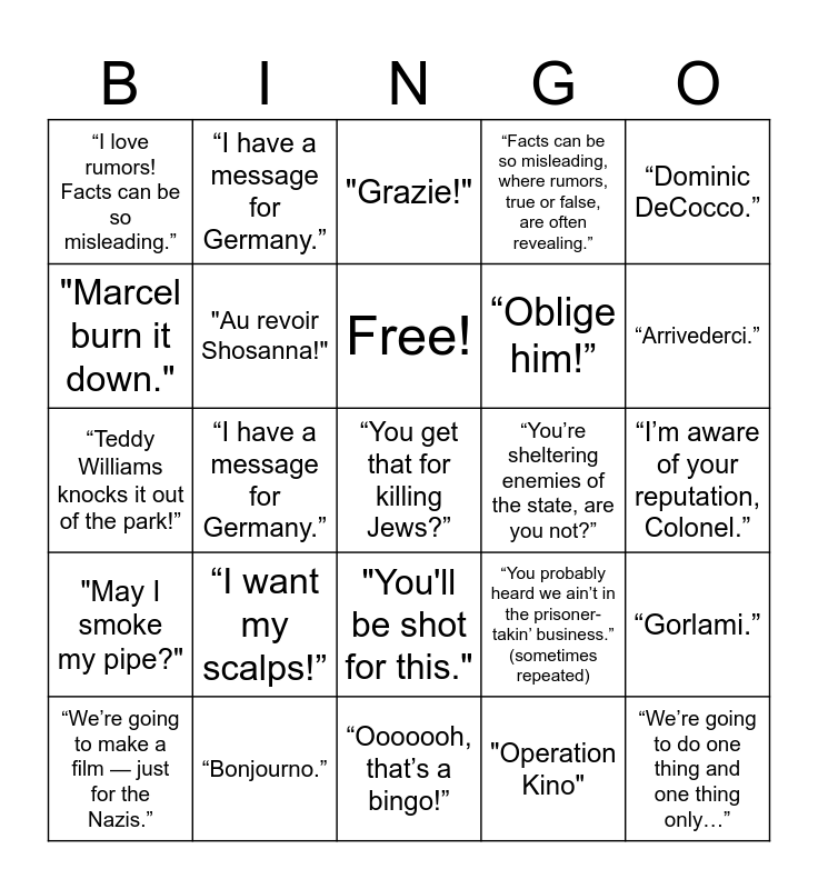 This bingo card has a free space and 24 words: “I want my scalps!”, “Bonjourno.”, Free!, “We’re going to make a film — just for the Nazis.”, “Dominic DeCocco.”, “I love rumors! Facts can be so misleading.”, "Marcel burn it down.", “I have a message for Germany.”, “You’re sheltering enemies of the state, are you not?”, "You'll be shot for this.", “Oblige him!”, “Teddy Williams knocks it out of the park!”, “You probably heard we ain’t in the prisoner-takin’ business.” (sometimes repeated), “Gorlami.”, "Au revoir Shosanna!", "Operation Kino", “I’m aware of your reputation, Colonel.”, "Grazie!", “Arrivederci.”, “I have a message for Germany.”, “We’re going to do one thing and one thing only…”, "May I smoke my pipe?", “Facts can be so misleading, where rumors, true or false, are often revealing.” and “Ooooooh, that’s a bingo!”.