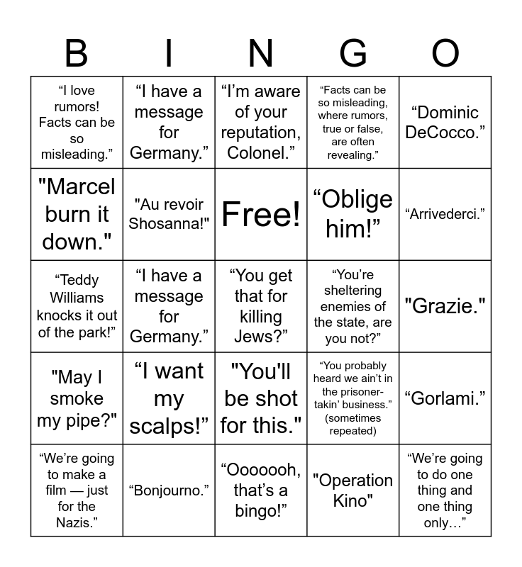 This bingo card has a free space and 24 words: “I want my scalps!”, “Bonjourno.”, Free!, “We’re going to make a film — just for the Nazis.”, “Dominic DeCocco.”, “I love rumors! Facts can be so misleading.”, "Marcel burn it down.", “I have a message for Germany.”, “You’re sheltering enemies of the state, are you not?”, "You'll be shot for this.", “Oblige him!”, “Teddy Williams knocks it out of the park!”, “You probably heard we ain’t in the prisoner-takin’ business.” (sometimes repeated), “Gorlami.”, "Au revoir Shosanna!", "Operation Kino", "Grazie.", “I’m aware of your reputation, Colonel.”, “Arrivederci.”, “I have a message for Germany.”, “We’re going to do one thing and one thing only…”, "May I smoke my pipe?", “Facts can be so misleading, where rumors, true or false, are often revealing.” and “Ooooooh, that’s a bingo!”.