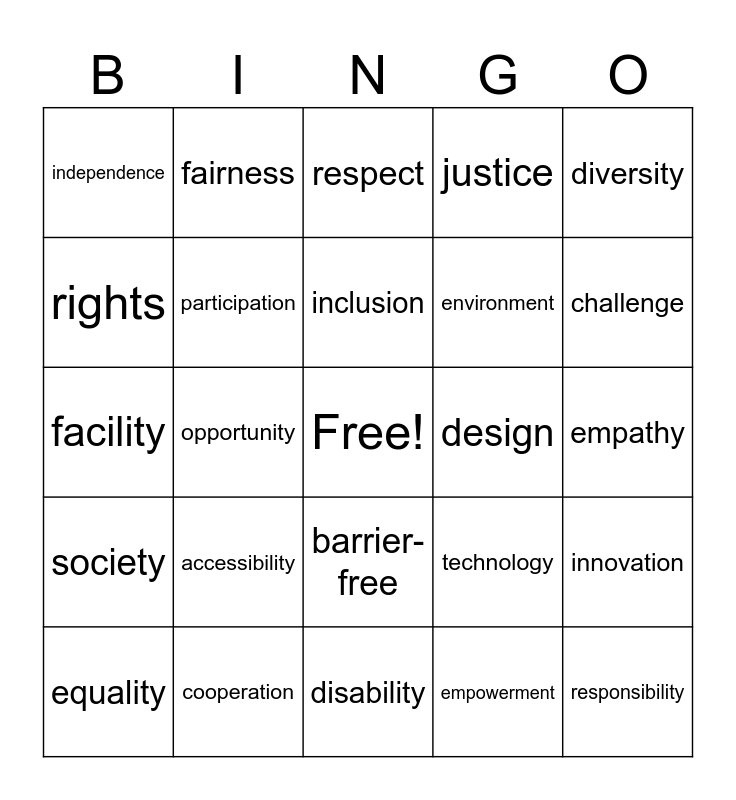 This bingo card has a free space and 25 words: accessibility, disability, inclusion, equality, diversity, independence, rights, fairness, design, barrier-free, environment, facility, technology, innovation, participation, communication, empathy, respect, challenge, opportunity, responsibility, cooperation, society, justice and empowerment.
