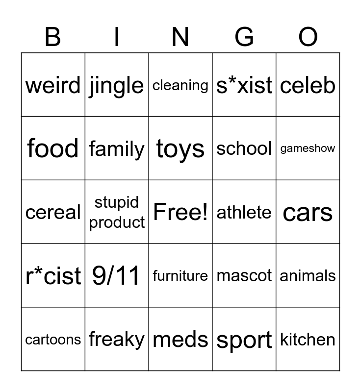 This bingo card has a free space and 24 words: 9/11, freaky, toys, cartoons, celeb, weird, food, jingle, athlete, furniture, school, cereal, mascot, animals, family, sport, cars, cleaning, gameshow, stupid product, kitchen, r*cist, s*xist and meds.