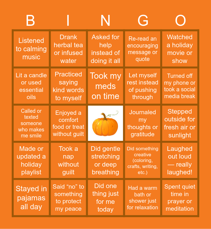This bingo card has a free space and 24 words: Took a nap without guilt, Said “no” to something to protect my peace, Took my meds on time, Stayed in pajamas all day, Watched a holiday movie or show, Listened to calming music, Lit a candle or used essential oils, Drank herbal tea or infused water, Journaled my thoughts or gratitude, Did gentle stretching or deep breathing, Let myself rest instead of pushing through, Called or texted someone who makes me smile, Did something creative (coloring, crafts, writing, etc.), Laughed out loud — really laughed!, Practiced saying kind words to myself, Had a warm bath or shower just for relaxation, Stepped outside for fresh air or sunlight, Asked for help instead of doing it all, Turned off my phone or took a social media break, Enjoyed a comfort food or treat without guilt, Spent quiet time in prayer or meditation, Made or updated a holiday playlist, Re-read an encouraging message or quote and Did one thing just for me today.