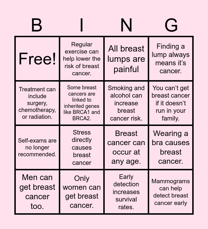 This bingo card has 16 words: Men can get breast cancer too., Only women can get breast cancer., All breast lumps are painful, Finding a lump always means it’s cancer., Treatment can include surgery, chemotherapy, or radiation., Regular exercise can help lower the risk of breast cancer., Breast cancer can occur at any age., Wearing a bra causes breast cancer., Free!, Some breast cancers are linked to inherited genes like BRCA1 and BRCA2., Early detection increases survival rates., You can’t get breast cancer if it doesn’t run in your family., Self-exams are no longer recommended., Stress directly causes breast cancer, Smoking and alcohol can increase breast cancer risk. and Mammograms can help detect breast cancer early.