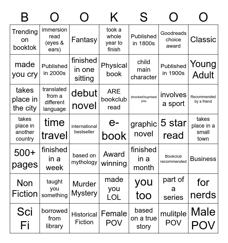 This bingo card has 82 words: Free!, Murder Mystery, Fantasy, Sci Fi, Self Help, Biography, Non Fiction, Fiction, Business, Historical Fiction, Humor, Romance, Classic, Young Adult, Thriller/Horror/Spooky, Trending on booktok, Recommended by a friend, Goodreads choice award, NY Times Bestseller, Award winning, Bookclub recommended, Published in 2000s, Published in 1900s, Published in 1800s, child main character, Male POV, Female POV, mulitple POV, Male author, Female author, debut novel, audiobook, Physical book, e-book, 5 star read, time travel, animal character, loveable side character, finished in one sitting, finished in a week, finished in a month, took a whole year to finish, DNF, long time TBR, part of a series, immersion read (eyes & ears), made you LOL, made you cry, hate read, new to you genre, takes place in a small town, takes place in the city, takes place in another country, NSFW, embarassing cover, involves food, for nerds, outside your comfort zone, taught you something, shocked/suprised you, unpredictable plot twist, would recommend to a friend, translated from a different language, 500+ pages, less than 100 pages, one word title, season in title, month in title, number in title, color in title, you too, celebrity endorsed, ARE bookclub read, international bestseller, re-read, based on a true story, based on mythology, contains a city you've been, graphic novel, borrowed from library, involves a sport and involves family.
