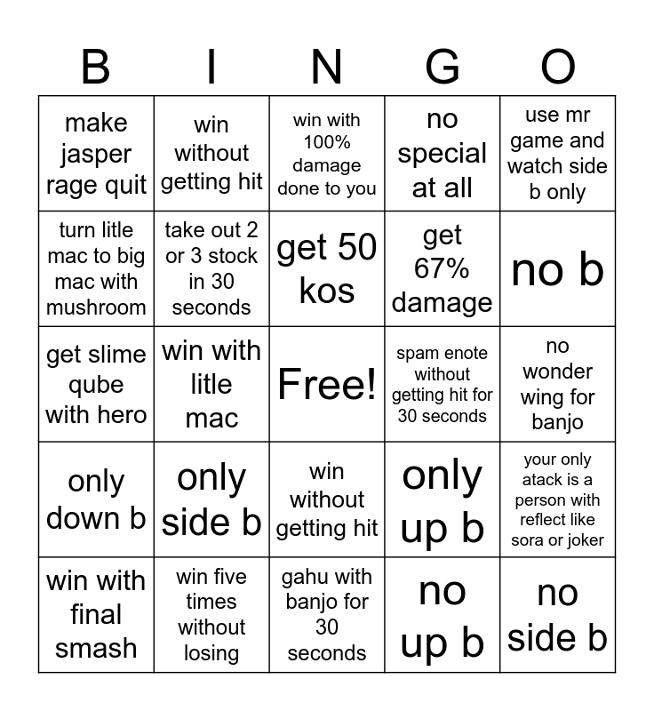 This bingo card has a free space and 30 words: win five times without losing, win with random, win with litle mac, win with mik fighter, make jasper rage quit, win with 100% damage done to you, take out 2 or 3 stock in 30 seconds, win without getting hit, spam enote without getting hit for 30 seconds, gahu with banjo for 30 seconds, no wonder wing for banjo, no side b, no up b, no down b, no b, only b, only up b, only down b, only side b, use mr game and watch side b only, get slime qube with hero, win in suden death, win without getting hit, get 67% damage, turn litle mac to big mac with mushroom, no special at all, your only atack is a person with reflect like sora or joker, win with final smash, get 50 kos and get 20 rounds.