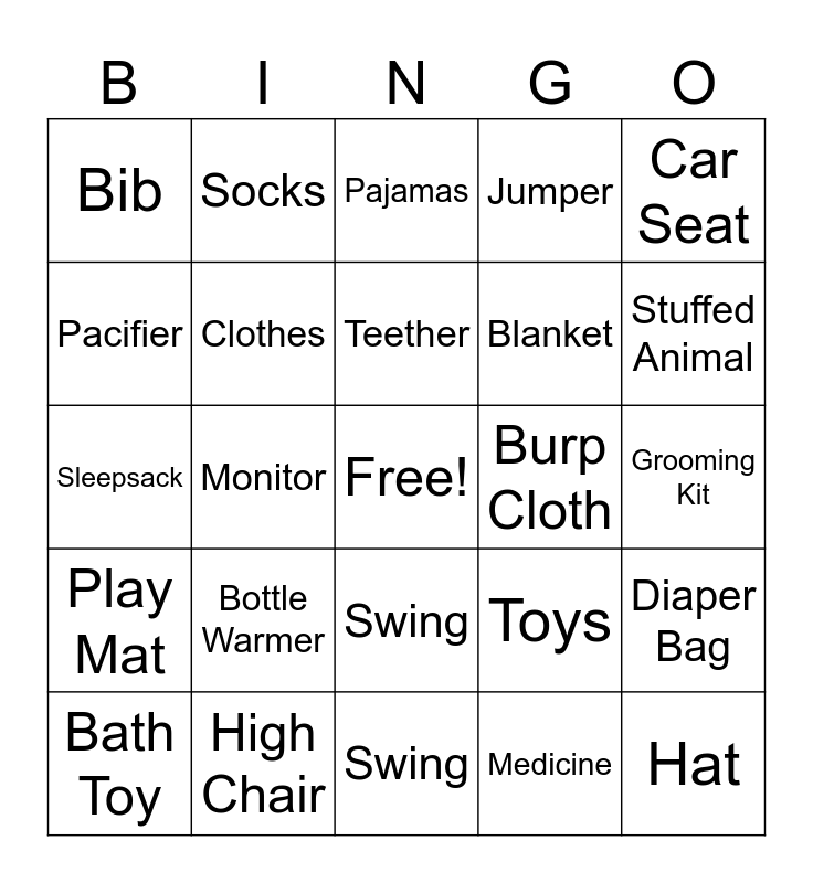 This bingo card has a free space and 24 words: Bottle Warmer, High Chair, Teether, Bath Toy, Car Seat, Bib, Pacifier, Socks, Burp Cloth, Swing, Blanket, Sleepsack, Toys, Diaper Bag, Clothes, Medicine, Grooming Kit, Pajamas, Stuffed Animal, Monitor, Hat, Play Mat, Jumper and Swing.