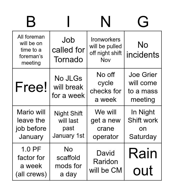 This bingo card has 16 words: No scaffold mods for a day, In Night Shift work on Saturday, Ironworkers will be pulled off night shift Nov, All foreman will be on time to a foreman’s meeting, Mario will leave the job before January, Job called for Tornado, We will get a new crane operator, David Raridon will be CM, Free!, No JLGs will break for a week, 1.0 PF factor for a week (all crews), No incidents, Night Shift will last past January 1st, Joe Grier will come to a mass meeting, No off cycle checks for a week and Rain out.