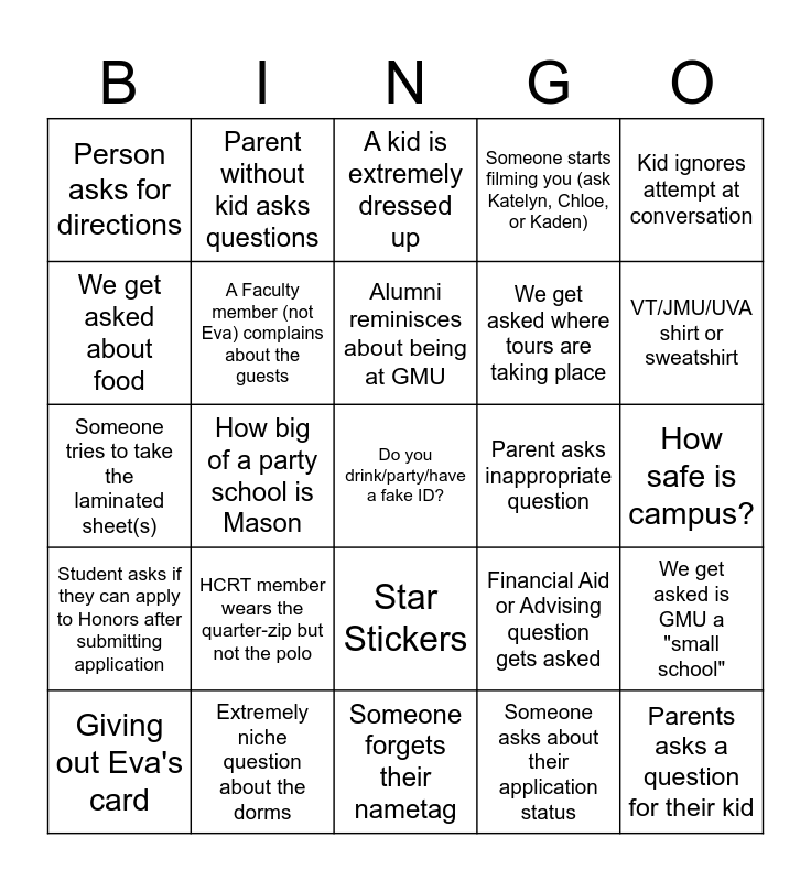 This bingo card has 25 words: HCRT member wears the quarter-zip but not the polo, Someone forgets their nametag, Alumni reminisces about being at GMU, Giving out Eva's card, Kid ignores attempt at conversation, Person asks for directions, We get asked about food, Parent without kid asks questions, Parent asks inappropriate question, Star Stickers, We get asked where tours are taking place, Someone tries to take the laminated sheet(s), Financial Aid or Advising question gets asked, We get asked is GMU a "small school", A Faculty member (not Eva) complains about the guests, Parents asks a question for their kid, How safe is campus?, A kid is extremely dressed up, VT/JMU/UVA shirt or sweatshirt, How big of a party school is Mason, Do you drink/party/have a fake ID?, Extremely niche question about the dorms, Student asks if they can apply to Honors after submitting application, Someone starts filming you (ask Katelyn, Chloe, or Kaden) and Someone asks about their application status.