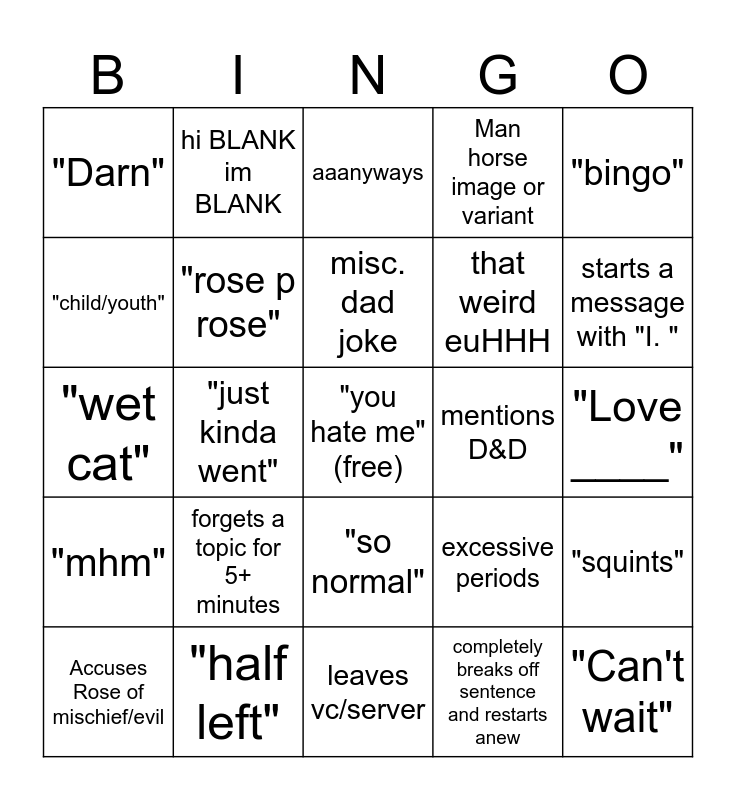 This bingo card has a free space and 24 words: forgets a topic for 5+ minutes, "half left", misc. dad joke, Accuses Rose of mischief/evil, "bingo", "Darn", "child/youth", hi BLANK im BLANK, mentions D&D, "so normal", that weird euHHH, "wet cat", excessive periods, "squints", "rose p rose", completely breaks off sentence and restarts anew, "Love ____", aaanyways, starts a message with "I. ", "just kinda went", "Can't wait", "mhm", Man horse image or variant and leaves vc/server.