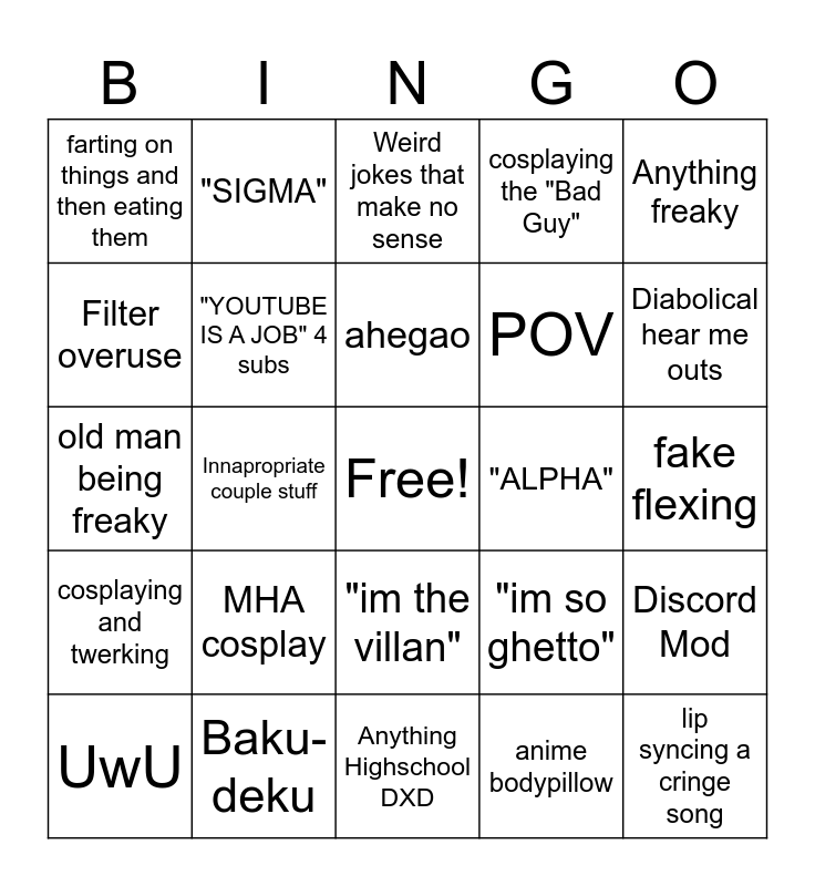 This bingo card has a free space and 24 words: MHA cosplay, Baku-deku, ahegao, UwU, Anything freaky, farting on things and then eating them, Filter overuse, "SIGMA", "ALPHA", "im the villan", POV, old man being freaky, "im so ghetto", Discord Mod, "YOUTUBE IS A JOB" 4 subs, anime bodypillow, fake flexing, Weird jokes that make no sense, Diabolical hear me outs, Innapropriate couple stuff, lip syncing a cringe song, cosplaying and twerking, cosplaying the "Bad Guy" and Anything Highschool DXD.
