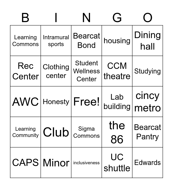 This bingo card has a free space and 24 words: Club, Minor, Student Wellness Center, CAPS, Dining hall, Learning Commons, Rec Center, Intramural sports, Lab building, Sigma Commons, CCM theatre, AWC, the 86, Bearcat Pantry, Clothing center, UC shuttle, cincy metro, Bearcat Bond, Studying, Honesty, Edwards, Learning Community, housing and inclusiveness.