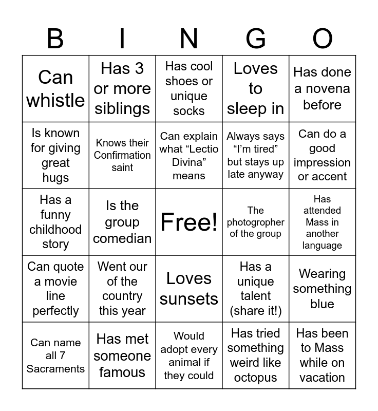 This bingo card has a free space and 29 words: Can name 3 mysteries of the Rosary, Has met someone famous, Has cool shoes or unique socks, Wearing a hoodie, Has done a novena before, Can whistle, Knows their Confirmation saint, Can explain what “Lectio Divina” means, The photogropher of the group, Wearing something blue, Can name all 7 Sacraments, Is the group comedian, Has tried something weird like octopus, Has been to Mass while on vacation, Has a funny childhood story, Has a part-time job, Would adopt every animal if they could, Has a unique talent (share it!), Can do a good impression or accent, Can quote a movie line perfectly, Went our of the country this year, Can’t stand pineapple on pizza, Always says “I’m tired” but stays up late anyway, Has attended Mass in another language, Is known for giving great hugs, Has 3 or more siblings, Loves sunsets, Loves to sleep in and Wearing a cross necklace.