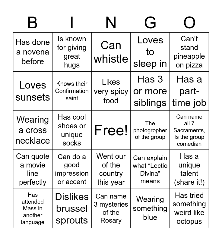 This bingo card has a free space and 31 words: Can name 3 mysteries of the Rosary, Has met someone famous, Has cool shoes or unique socks, Wearing a hoodie, Has done a novena before, Can whistle, Knows their Confirmation saint, Can explain what “Lectio Divina” means, The photogropher of the group, Wearing something blue, Can name all 7 Sacraments, Is the group comedian, Has tried something weird like octopus, Has been to Mass while on vacation, Has a funny childhood story, Has a part-time job, Would adopt every animal if they could, Has a unique talent (share it!), Can do a good impression or accent, Can quote a movie line perfectly, Went our of the country this year, Can’t stand pineapple on pizza, Always says “I’m tired” but stays up late anyway, Has attended Mass in another language, Is known for giving great hugs, Has 3 or more siblings, Loves sunsets, Loves to sleep in, Wearing a cross necklace, Dislikes brussel sprouts, Likes very spicy food and Likes superhero movies.