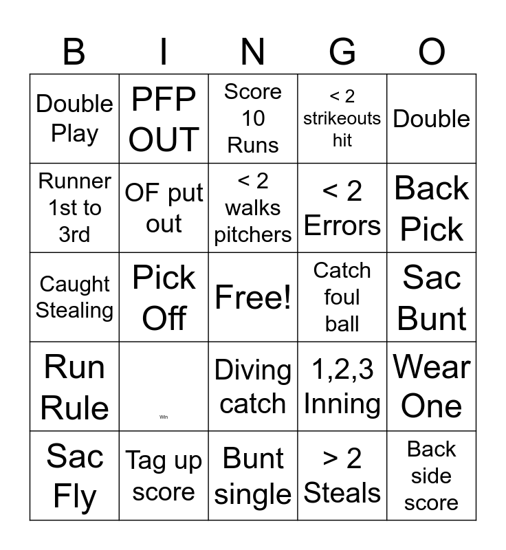 This bingo card has a free space and 24 words: Win, Tag up score, < 2 walks pitchers, Sac Fly, Double, Double Play, Runner 1st to 3rd, PFP OUT, Catch foul ball, Diving catch, < 2 Errors, Caught Stealing, 1,2,3 Inning, Wear One, OF put out, > 2 Steals, Sac Bunt, Score 10 Runs, Back Pick, Pick Off, Back side score, Run Rule, < 2 strikeouts hit and Bunt single.