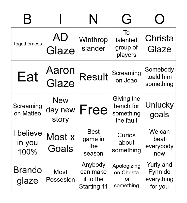This bingo card has a free space and 24 words: Most x Goals, Most Possesion, Result, Brando glaze, Christa Glaze, Togetherness, Eat, AD Glaze, Giving the bench for something the fault, Best game in the season, Screaming on Joao, Screaming on Matteo, Curios about something, We can beat everybody now, Aaron Glaze, Apologizing on Christa for something, Unlucky goals, Winthrop slander, Somebody toald him something, New day new story, Yuriy and Fynn do everything for you, I believe in you 100%, To talented group of players and Anybody can make it to the Starting 11.