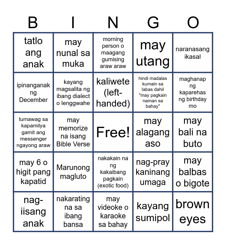 This bingo card has a free space and 24 words: Marunong magluto, nakarating na sa ibang bansa, kaliwete (left-handed), nag-iisang anak, naranasang ikasal, tatlo ang anak, ipinanganak ng December, may nunal sa muka, may alagang aso, nakakain na ng kakaibang pagkain (exotic food), hindi madalas kumain sa labas dahil "may pagkain naman sa bahay", tumawag sa kapamilya gamit ang messenger ngayong araw, nag-pray kaninang umaga, may balbas o bigote, kayang magsalita ng ibang dialect o lenggwahe, kayang sumipol, may bali na buto, morning person o maagang gumising araw araw, maghanap ng kaparehas ng birthday mo, may memorize na isang Bible Verse, brown eyes, may 6 o higit pang kapatid, may utang and may videoke o karaoke sa bahay.