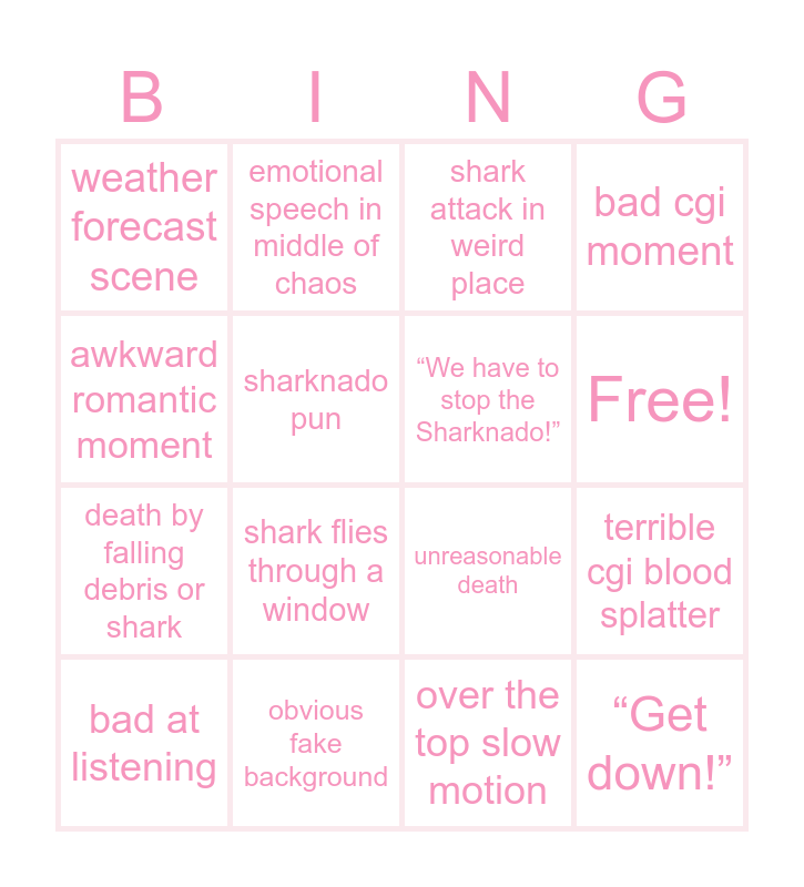 This bingo card has 1 images and 35 words: outrageous plottwist, horrible acting, someone yells “Shark!”, “We have to stop the Sharknado!”, shark bites someone mid-air, bad cgi moment, sharknado pun, that doesnt make sense, Free!, random heroic sacrifice, unreasonable death, awkward romantic moment, random side mission, Shark lands in car/vehicle, weather forecast scene, obvious fake background, outrageous use of weapon, terrible cgi blood splatter, “Get down!”, bad at listening, crazy plot amor, "Whats going on!?", random solution to sharknado, terrible background extras, shark attack in weird place, shark flies through a window, tornado physics = none, one-liner before killing shark, death by falling debris or shark, over the top slow motion, multiple sharknados, dramatic lightning strike, "cant believe this is happening", emotional speech in middle of chaos and explanation of sharknado scientifically.