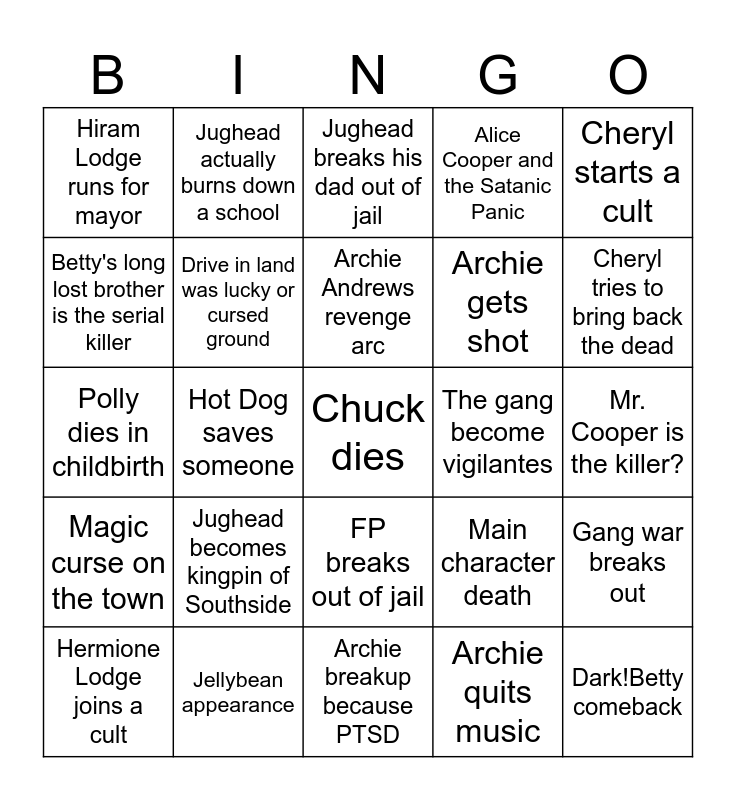 This bingo card has 25 words: Jughead becomes kingpin of Southside, Archie breakup because PTSD, Archie Andrews revenge arc, Hermione Lodge joins a cult, Cheryl starts a cult, Hiram Lodge runs for mayor, Betty's long lost brother is the serial killer, Jughead actually burns down a school, The gang become vigilantes, FP breaks out of jail, Archie gets shot, Polly dies in childbirth, Main character death, Gang war breaks out, Drive in land was lucky or cursed ground, Dark!Betty comeback, Mr. Cooper is the killer?, Jughead breaks his dad out of jail, Cheryl tries to bring back the dead, Hot Dog saves someone, Chuck dies, Jellybean appearance, Magic curse on the town, Alice Cooper and the Satanic Panic and Archie quits music.