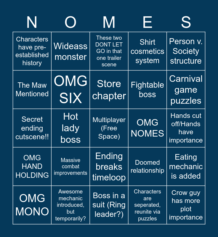 This bingo card has a free space and 24 words: Massive combat improvements, Awesome mechanic introduced, but temporarily?, Store chapter, OMG MONO, Person v. Society structure, Characters have pre-established history, The Maw Mentioned, Wideass monster, OMG NOMES, Ending breaks timeloop, Fightable boss, Secret ending cutscene!!, Doomed relationship, Eating mechanic is added, OMG SIX, Characters are seperated, reunite via puzzles, Hands cut off/Hands have importance, These two DONT LET GO in that one trailer scene, Carnival game puzzles, Hot lady boss, Crow guy has more plot importance, OMG HAND HOLDING, Shirt cosmetics system and Boss in a suit (Ring leader?).