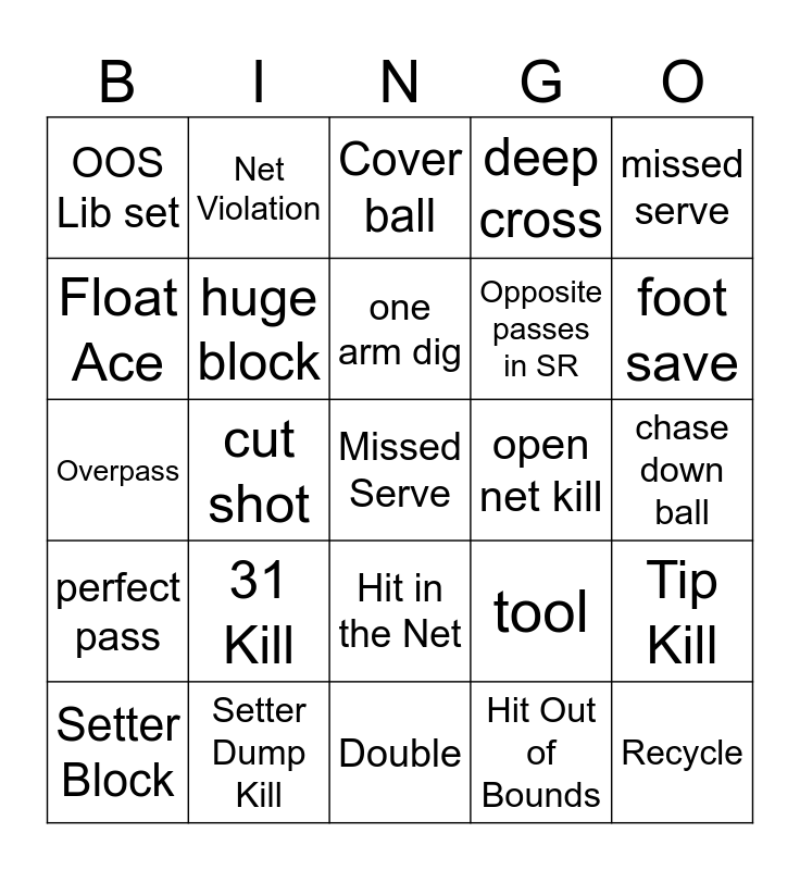 This bingo card has a free space and 36 words: Free ball, Ace, middle kill, huge block, tool, perfect pass, one arm dig, crazy up, missed serve, line kill, cut shot, deep cross, huge bounce, open net kill, foot save, OOS Lib set, Middle OOS set, 31 Kill, Recycle, Cover ball, chase down ball, Tip Kill, Setter Dump Kill, Setter Block, Double, Net Violation, Overpass, Defender follows ball to line (out), Opposite passes in SR, Float Ace, Top spin Ace, Shank, Hit Out of Bounds, Hit in the Net, Perfect Dig and Pancake.