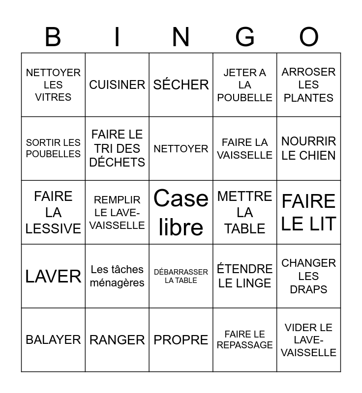 This bingo card has a free space and 24 words: Les tâches ménagères, RANGER, NETTOYER, BALAYER, ARROSER LES PLANTES, NETTOYER LES VITRES, SORTIR LES POUBELLES, CUISINER, METTRE LA TABLE, DÉBARRASSER LA TABLE, FAIRE LA VAISSELLE, FAIRE LA LESSIVE, ÉTENDRE LE LINGE, CHANGER LES DRAPS, FAIRE LE TRI DES DÉCHETS, FAIRE LE REPASSAGE, FAIRE LE LIT, SÉCHER, NOURRIR LE CHIEN, REMPLIR LE LAVE-VAISSELLE, VIDER LE LAVE-VAISSELLE, LAVER, JETER A LA POUBELLE and PROPRE.