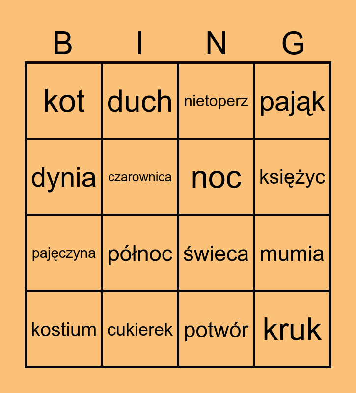 This bingo card has 18 words: dynia, cukierek, nietoperz, pająk, pajęczyna, duch, świeca, księżyc, kot, północ, potwór, mumia, kostium, czarownica, noc, kruk, kruk and jabłko.
