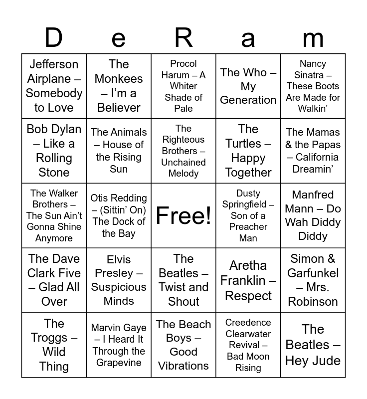 This bingo card has a free space and 51 words: Hey Jude, The Beatles – Hey Jude, The Rolling Stones – (I Can’t Get No) Satisfaction, The Beach Boys – Good Vibrations, Elvis Presley – Suspicious Minds, The Supremes – You Can’t Hurry Love, The Monkees – I’m a Believer, The Kinks – You Really Got Me, Bob Dylan – Like a Rolling Stone, The Doors – Light My Fire, The Animals – House of the Rising Sun, The Who – My Generation, Simon & Garfunkel – Mrs. Robinson, Aretha Franklin – Respect, The Byrds – Mr. Tambourine Man, The Hollies – He Ain’t Heavy, He’s My Brother, The Righteous Brothers – Unchained Melody, Dusty Springfield – Son of a Preacher Man, The Four Tops – Reach Out (I’ll Be There), Nancy Sinatra – These Boots Are Made for Walkin’, Otis Redding – (Sittin’ On) The Dock of the Bay, Creedence Clearwater Revival – Bad Moon Rising, Jefferson Airplane – Somebody to Love, The Turtles – Happy Together, The Zombies – She’s Not There, The Temptations – My Girl, The Mamas & the Papas – California Dreamin’, The Lovin’ Spoonful – Summer in the City, The Troggs – Wild Thing, Procol Harum – A Whiter Shade of Pale, The Beatles – Come Together, The Rolling Stones – Paint It Black, The Beach Boys – Surfin’ U.S.A., The Byrds – Turn! Turn! Turn!, Sam Cooke – A Change Is Gonna Come, Marvin Gaye – I Heard It Through the Grapevine, The Moody Blues – Nights in White Satin, The Ventures – Wipe Out, Roy Orbison – Oh, Pretty Woman, The Spencer Davis Group – Gimme Some Lovin’, Manfred Mann – Do Wah Diddy Diddy, The Dave Clark Five – Glad All Over, Tommy James & The Shondells – Mony Mony, The Shadows – Apache, The Box Tops – The Letter, The Foundations – Build Me Up Buttercup, The Walker Brothers – The Sun Ain’t Gonna Shine Anymore, Del Shannon – Runaway, The Supremes – Stop! In the Name of Love, The Beatles – Twist and Shout and The Rolling Stones – Get Off of My Cloud.