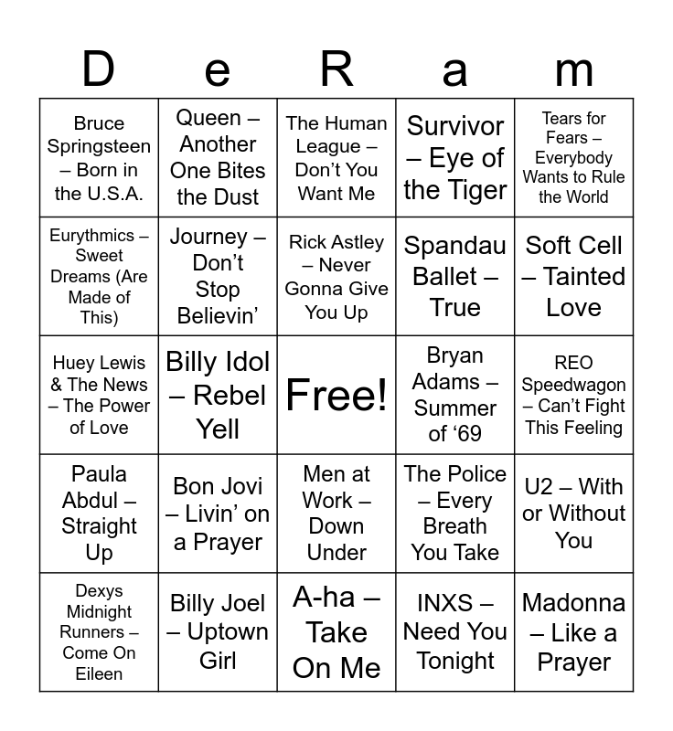 This bingo card has a free space and 50 words: Michael Jackson – Billie Jean, Madonna – Like a Prayer, Prince – Purple Rain, A-ha – Take On Me, Bon Jovi – Livin’ on a Prayer, Whitney Houston – I Wanna Dance With Somebody, Queen – Another One Bites the Dust, Toto – Africa, Eurythmics – Sweet Dreams (Are Made of This), Cyndi Lauper – Girls Just Want to Have Fun, Journey – Don’t Stop Believin’, Survivor – Eye of the Tiger, U2 – With or Without You, The Police – Every Breath You Take, Duran Duran – Hungry Like the Wolf, George Michael – Faith, Rick Astley – Never Gonna Give You Up, Bryan Adams – Summer of ‘69, Simple Minds – Don’t You (Forget About Me), Tears for Fears – Everybody Wants to Rule the World, Billy Idol – Rebel Yell, INXS – Need You Tonight, Bruce Springsteen – Born in the U.S.A., Spandau Ballet – True, Wham! – Wake Me Up Before You Go-Go, Depeche Mode – Enjoy the Silence, Soft Cell – Tainted Love, Queen & David Bowie – Under Pressure, The Human League – Don’t You Want Me, Men at Work – Down Under, The Bangles – Walk Like an Egyptian, Pat Benatar – Love Is a Battlefield, Roxette – The Look, Europe – The Final Countdown, Billy Joel – Uptown Girl, Cutting Crew – (I Just) Died in Your Arms, UB40 – Red Red Wine, The Cure – Just Like Heaven, Phil Collins – In the Air Tonight, REO Speedwagon – Can’t Fight This Feeling, Bananarama – Venus, Frankie Goes to Hollywood – Relax, Culture Club – Karma Chameleon, Belinda Carlisle – Heaven Is a Place on Earth, Dexys Midnight Runners – Come On Eileen, Huey Lewis & The News – The Power of Love, Lionel Richie – All Night Long, Nena – 99 Luftballons, Paula Abdul – Straight Up and John Farnham – You’re the Voice.