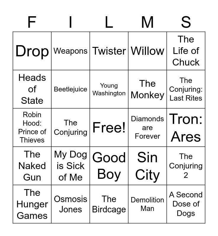 This bingo card has a free space and 64 words: The Bone Collector, Jurassic World: Rebirth, Legion, The Conjuring 2, Woman in the Yard, Wake Up Dead Man, Weapons, Maze Runner: The Scorch Trials, Young Washington, Good Fortune, Good Boy, Freaky Tales, Tron: Ares, The Life of Chuck, Now You See Me Now You Don't, Heads of State, The Conjuring, Drop, Black Phone 2, The Monkey, My Dog is Sick of Me, The Naked Gun, Willow, Twisters, The Fantastic 4: First Steps, Superman, Thunderbolts, The Ballad of Songbirds & Snakes, Knives Out, He-Man, Ballerina, Glass Onion, Together, Warfare, The Conjuring: Last Rites, The Hunger Games, Indiana Jones & The Crystal Skull, Demolition Man, Misery, Beetlejuice, Robin Hood: Prince of Thieves, Diamonds are Forever, Aquaman, Trading Places, The Howling, A Second Dose of Dogs, Osmosis Jones, Captain America, Sin City, Black Panther, Dr. No, Alien Resurrection, The Birdcage, Star Trek The Motion Picture, The English Patient, Vertigo, Twister, Jaws 2, 21 Jump Street, Field of Dreams, Broadcast News, Easy A, Captain Phillips and Super Troopers.