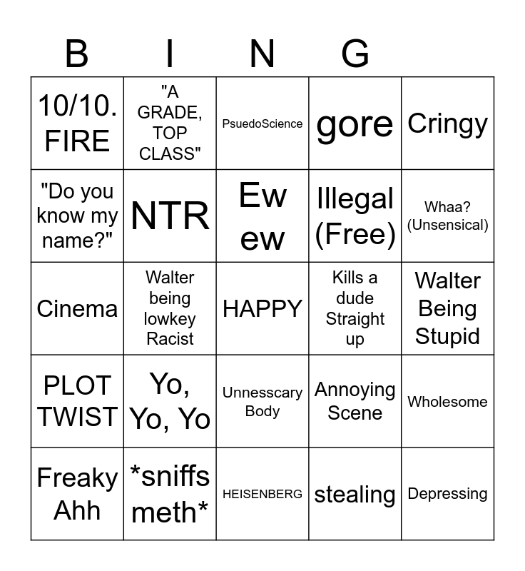 This bingo card has 25 words: Yo, Yo, Yo, HEISENBERG, Ew ew, Freaky Ahh, Cringy, 10/10. FIRE, "Do you know my name?", "A GRADE, TOP CLASS", Kills a dude Straight up, Unnesscary Body, Illegal (Free), Cinema, Annoying Scene, Wholesome, NTR, Depressing, Walter Being Stupid, PsuedoScience, Whaa? (Unsensical), Walter being lowkey Racist, HAPPY, *sniffs meth*, PLOT TWIST, gore and stealing.