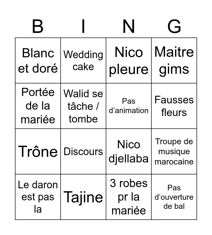 This bingo card has 16 words: Tajine, Troupe de musique marocaine, Nico pleure, Blanc et doré, Trône, Wedding cake, Nico djellaba, 3 robes pr la mariée, Portée de la mariée, Walid se tâche / tombe, Le daron est pas la, Maitre gims, Discours, Fausses fleurs, Pas d’animation and Pas d’ouverture de bal.