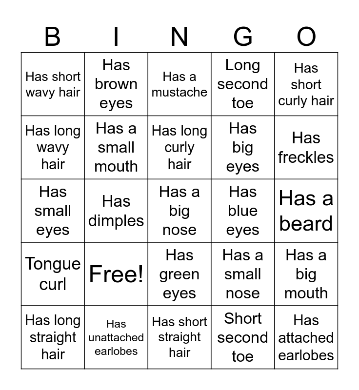 This bingo card has a free space and 25 words: Free!, Has short straight hair, Has long curly hair, Has long straight hair, Has short curly hair, Has short wavy hair, Has long wavy hair, Has brown eyes, Has blue eyes, Has green eyes, Has big eyes, Has small eyes, Has a small nose, Has a big mouth, Has a small mouth, Wears glasses, Has a beard, Has a mustache, Has freckles, Has dimples, Has attached earlobes, Has unattached earlobes, Tongue curl, Long second toe and Short second toe.