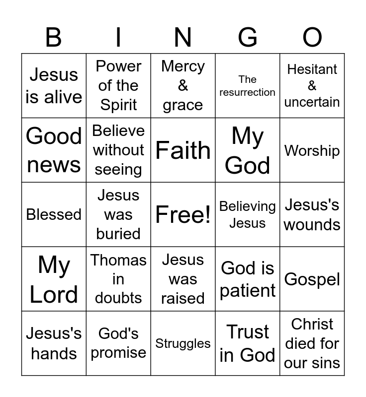 This bingo card has a free space and 24 words: Jesus's hands, Thomas in doubts, Faith, Trust in God, Hesitant & uncertain, Jesus is alive, Power of the Spirit, Mercy & grace, Believing Jesus, Jesus's wounds, Blessed, Believe without seeing, God is patient, Gospel, Good news, God's promise, Struggles, The resurrection, Worship, My Lord, Jesus was buried, Jesus was raised, My God and Christ died for our sins.