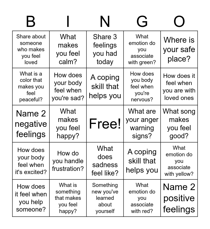 This bingo card has a free space and 24 words: How do you handle frustration?, What is something that makes you feel happy?, A coping skill that helps you, How does it feel when you help someone?, Where is your safe place?, Share about someone who makes you feel loved, What is a color that makes you feel peaceful?, What makes you feel calm?, What are your anger warning signs?, What does sadness feel like?, How does you body feel when you're nervous?, Name 2 negative feelings, A coping skill that helps you, What emotion do you associate with yellow?, How does your body feel when you're sad?, What emotion do you associate with red?, What song makes you feel good?, Share 3 feelings you had today, How does it feel when you are with loved ones, What makes you feel happy?, Name 2 positive feelings, How does your body feel when it's excited?, What emotion do you associate with green? and Something new you've learned about yourself.