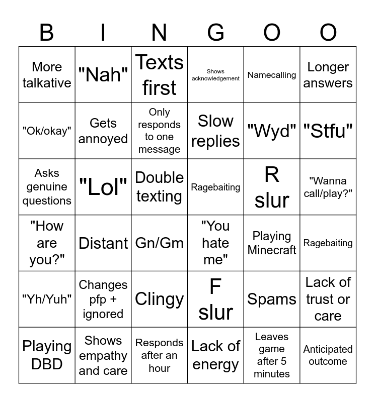 This bingo card has 48 words: "Yh/Yuh", "Lol", "67", Shows acknowledgement, Playing Minecraft, Anticipated outcome, More talkative, Putting effort in responses, Texts first, "You hate me", "Wyd", Longer answers, Asks genuine questions, Changes pfp + ignored, Dry, Ragebaiting, R slur, "Wanna call/play?", Playing DBD, "Nah", Double texting, Slow replies, Namecalling, "Stfu", One word responses, Gets annoyed, Gn/Gm, Only responds to one question, Spams, Ragebaiting, Fast replies, Shows empathy and care, Responds after an hour, F slur, Leaves game after 5 minutes, Triple text, "How are you?", Distant, Clingy, Lack of energy, Shows empathy and care, Lack of trust or care, "Ok/okay", Sudden passive aggressiveness, Only responds to one message, Doesn't acknowledge previous messages, Ask genuine questions and "Go sleep".