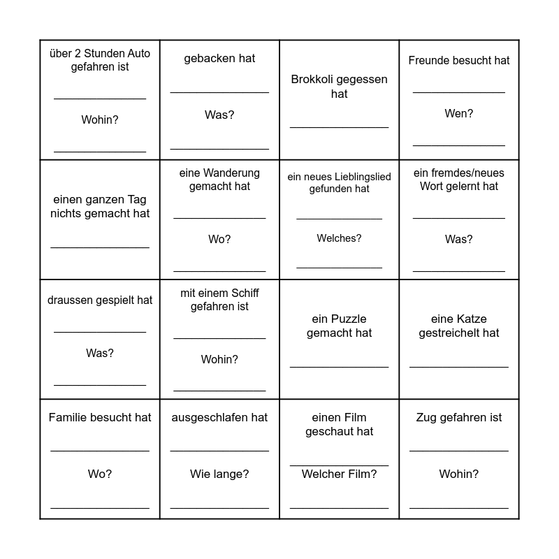 This bingo card has 16 words: ausgeschlafen hat _______________ Wie lange? _______________, eine Katze gestreichelt hat _______________, Brokkoli gegessen hat _______________, über 2 Stunden Auto gefahren ist _______________ Wohin? _______________, draussen gespielt hat _______________ Was? _______________, gebacken hat _______________ Was? _______________, ein Puzzle gemacht hat _______________, einen Film geschaut hat _______________ Welcher Film? _______________, einen ganzen Tag nichts gemacht hat _______________, eine Wanderung gemacht hat _______________ Wo? _______________, Familie besucht hat _______________ Wo? _______________, Freunde besucht hat _______________ Wen? _______________, mit einem Schiff gefahren ist _______________ Wohin? _______________, ein fremdes/neues Wort gelernt hat _______________ Was? _______________, ein neues Lieblingslied gefunden hat _______________ Welches? _______________ and Zug gefahren ist _______________ Wohin? _______________.