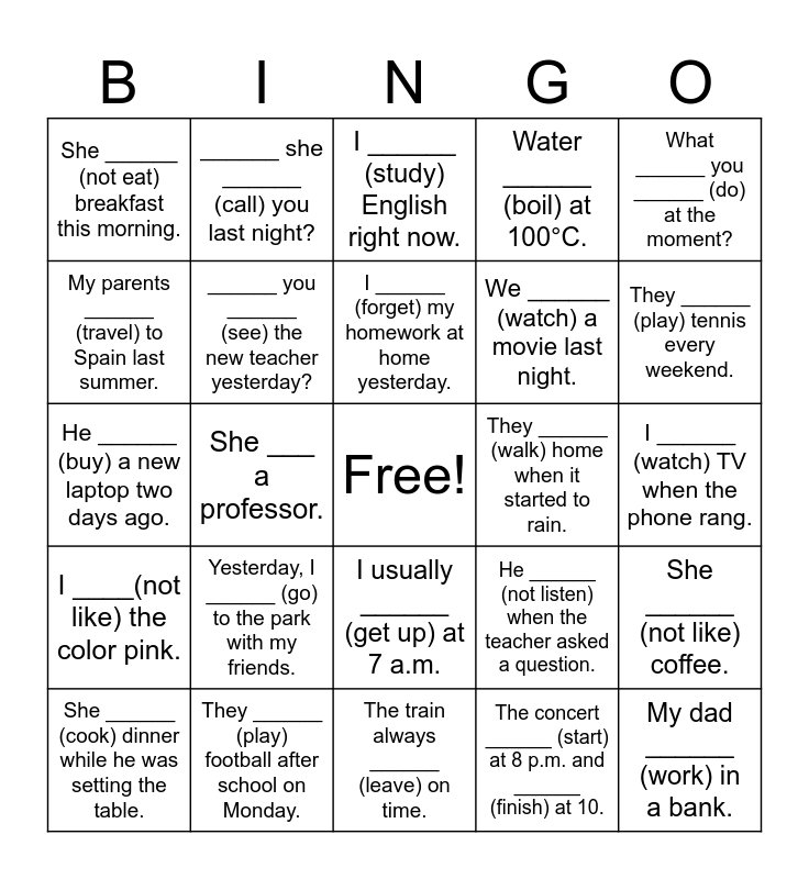 This bingo card has a free space and 24 words: Yesterday, I ______ (go) to the park with my friends., They ______ (play) football after school on Monday., I ______ (forget) my homework at home yesterday., She ______ (cook) dinner while he was setting the table., What ______ you ______ (do) at the moment?, She ______ (not eat) breakfast this morning., My parents ______ (travel) to Spain last summer., ______ she ______ (call) you last night?, They ______ (walk) home when it started to rain., I usually ______ (get up) at 7 a.m., We ______ (watch) a movie last night., He ______ (buy) a new laptop two days ago., He ______ (not listen) when the teacher asked a question., She ______ (not like) coffee., ______ you ______ (see) the new teacher yesterday?, The concert ______ (start) at 8 p.m. and ______ (finish) at 10., I ______ (watch) TV when the phone rang., I ______ (study) English right now., They ______ (play) tennis every weekend., She ___ a professor., My dad ______ (work) in a bank., I ____(not like) the color pink., Water ______ (boil) at 100°C. and The train always ______ (leave) on time..