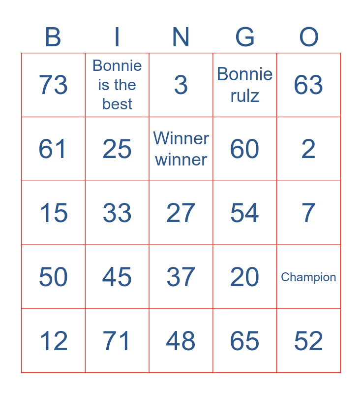 This bingo card has 29 words: 12, 18, 33, 52, 73, 3, 25, 45, 54, 71, 7, 27, 48, 65, 2, 22, 37, 50, 63, 15, 20, 44, 60, 61, Bonnie rulz, Bonnie is the best, Champion, Winner winner and Chicken dinner.