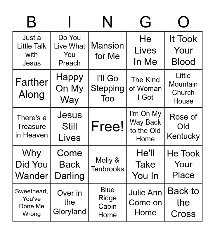 This bingo card has a free space and 50 words: Angel Band, Back to the Cross, Beautiful Star of Bethlehem, Blue Ridge Cabin Home, Come Back Darling, Dim Lights Thick Smoke, Do You Live What You Preach, Don't Act, Farther Along, Green Pastures, Happy On My Way, He Lives In Me, He Took Your Place, He'll Take You In, Help is on the Way, Hot Corn, Cold Corn, I'll Go Stepping Too, I'm On My Way Back to the Old Home, I'm Using My Bible for a Road Map, It Took Your Blood, Jesus Still Lives, Julie Ann Come on Home, Just a Little Talk with Jesus, The Kind of Woman I Got, Leftover Biscuits, Life's Railway to Heaven, Little Mountain Church House, Little White Church, Mansion for Me, Molly & Tenbrooks, My Sweet Blue Eyed Darling, Nothing Can Touch Me, Ocean of Diamonds, On My Way Back to the Old Home, Over in the Gloryland, Precious Memories, Remember the Cross, River of Death, Roll in My Sweet Baby's Arms, Rose of Old Kentucky, Sea of Regret, She's No Angel, Stairway to Heaven, Sugar Coated Love, Sweetheart, You've Done Me Wrong, There's a Treasure in Heaven, Til the End of the World Rolls Round, Where the Soul of Man, Why Did You Wander and Your Love is Like a Flower.