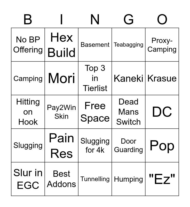 This bingo card has a free space and 24 words: Pain Res, Best Addons, Top 3 in Tierlist, Slur in EGC, Proxy-Camping, No BP Offering, Camping, Hex Build, Dead Mans Switch, Slugging for 4k, Kaneki, Hitting on Hook, Door Guarding, Pop, Mori, Humping, DC, Basement, Krasue, Pay2Win Skin, "Ez", Slugging, Teabagging and Tunnelling.