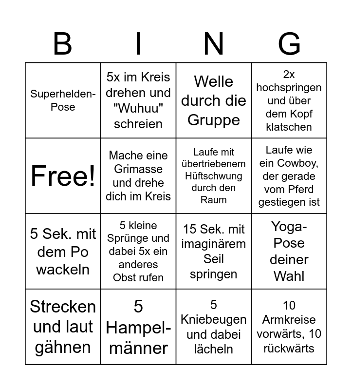This bingo card has 16 words: 5 Hampel-männer, Yoga- Pose deiner Wahl, Welle durch die Gruppe, Superhelden- Pose, 5 Sek. mit dem Po wackeln, 5x im Kreis drehen und "Wuhuu" schreien, 15 Sek. mit imaginärem Seil springen, 5 Kniebeugen und dabei lächeln, Free!, Mache eine Grimasse und drehe dich im Kreis, Strecken und laut gähnen, 2x hochspringen und über dem Kopf klatschen, 5 kleine Sprünge und dabei 5x ein anderes Obst rufen, Laufe wie ein Cowboy, der gerade vom Pferd gestiegen ist, Laufe mit übertriebenem Hüftschwung durch den Raum and 10 Armkreise vorwärts, 10 rückwärts.
